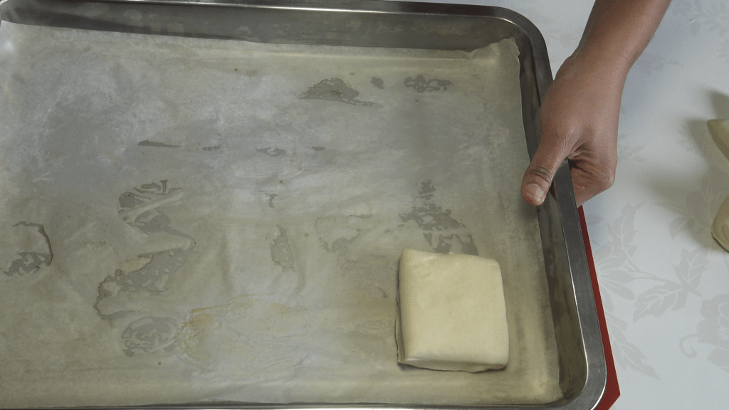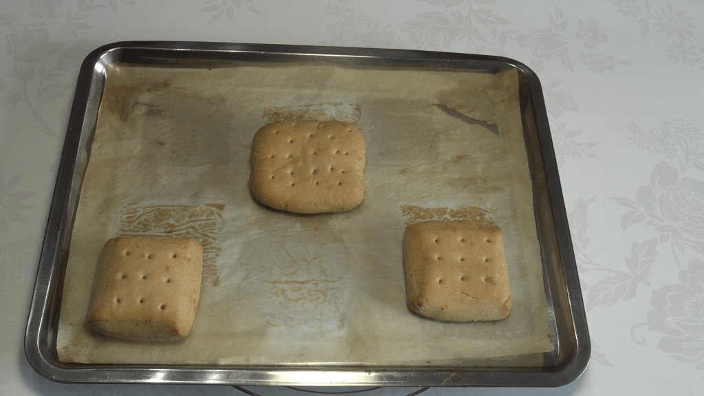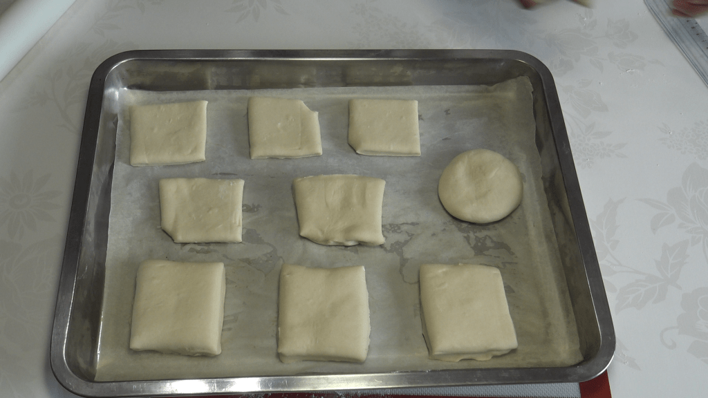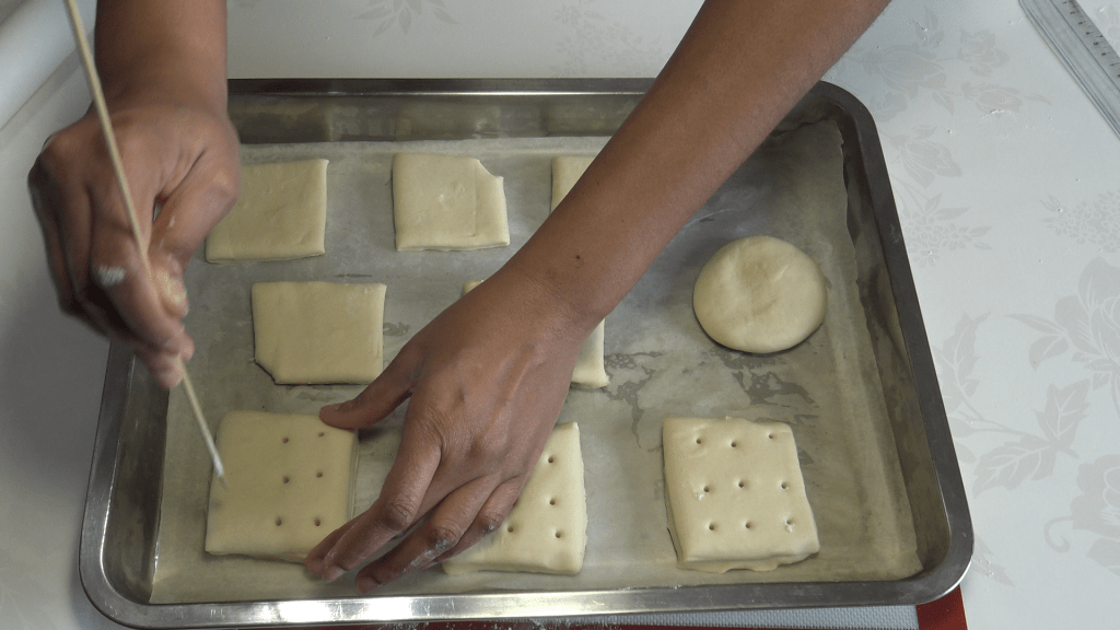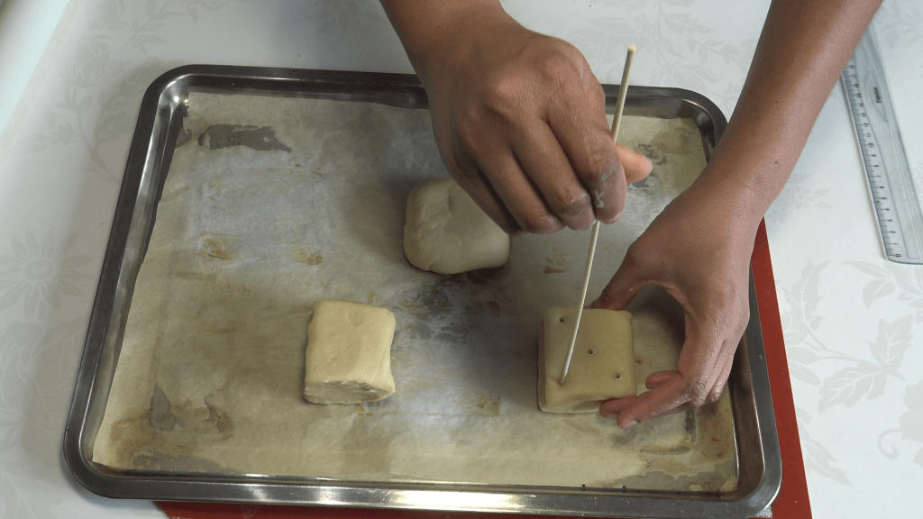 Découper des carrées d’environ 10 x 10 cm (ou plus petits) et les disposer sur une plaque de cuisson graissée et farinée et les piquer avec un cure dents.