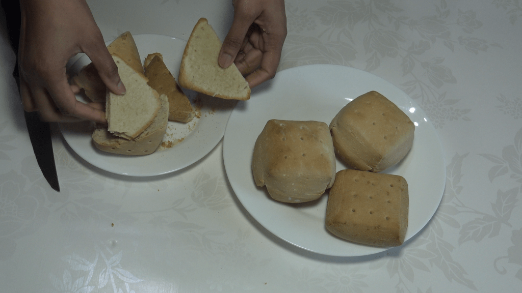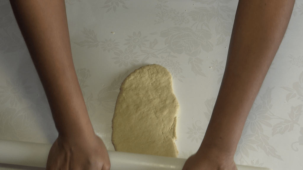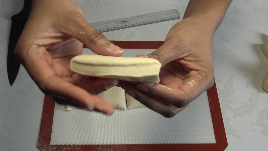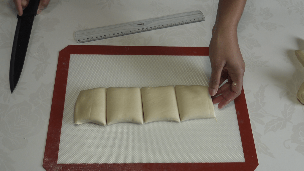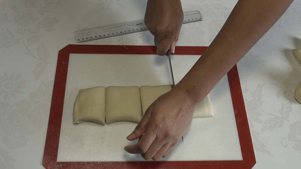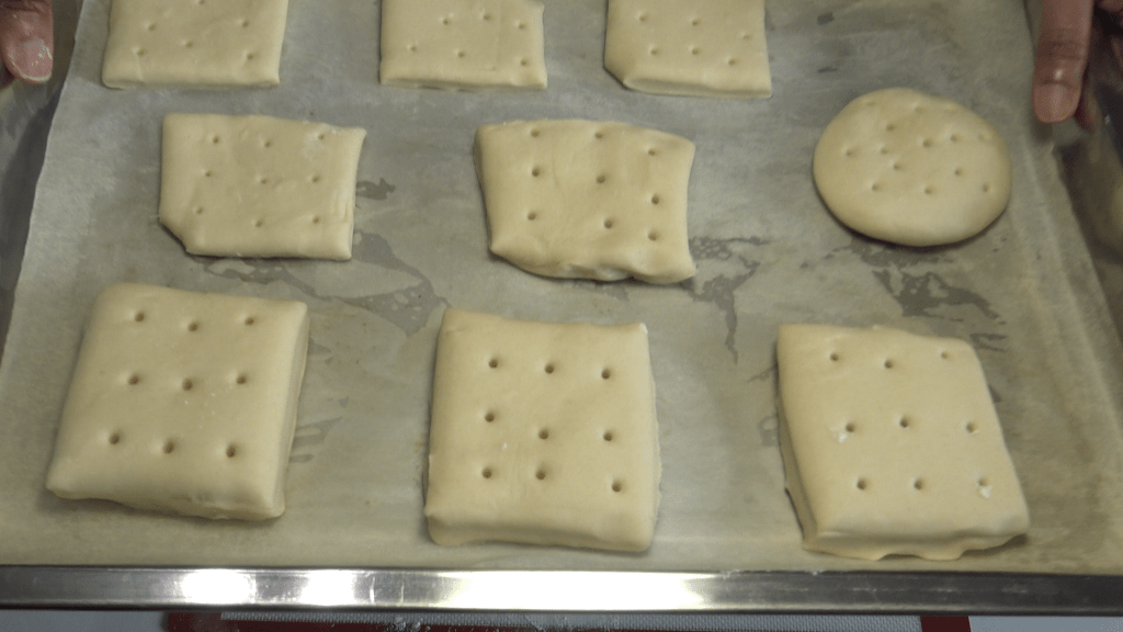 Découper des carrées d’environ 10 x 10 cm (ou plus petits) et les disposer sur une plaque de cuisson graissée et farinée et les piquer avec un cure dents.