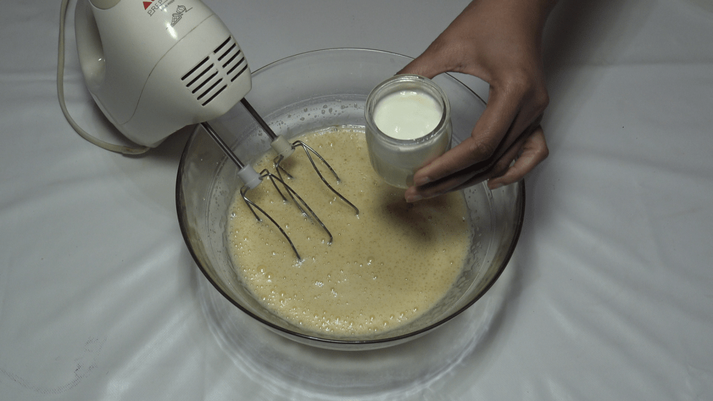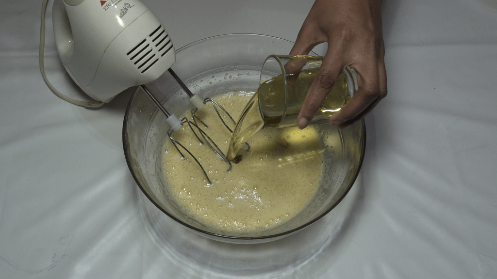 Fouetter les œufs avec le sucre, ajouter la vanille, suivi de l’huile et du yaourt.