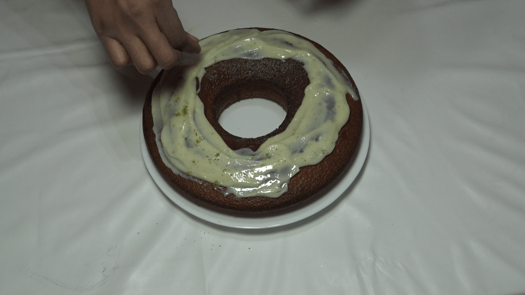 L’étaler sur le gâteau et saupoudrer du reste de zeste.