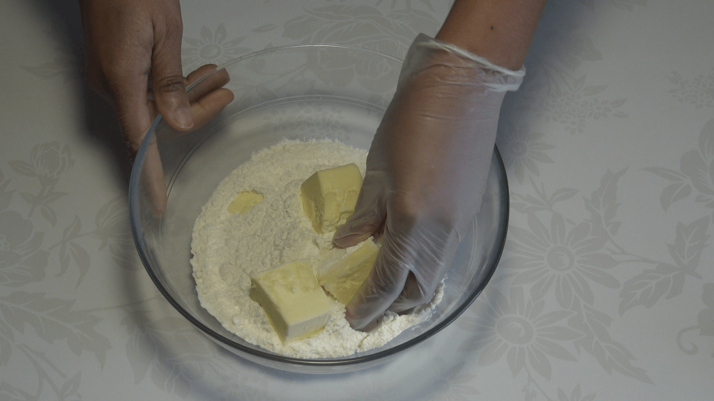 Préparer la pâte brisée (ou la pate sablée) : Dans un saladier, mélanger la farine avec le sel et le beurre pour obtenir une texture un peu sableuse.