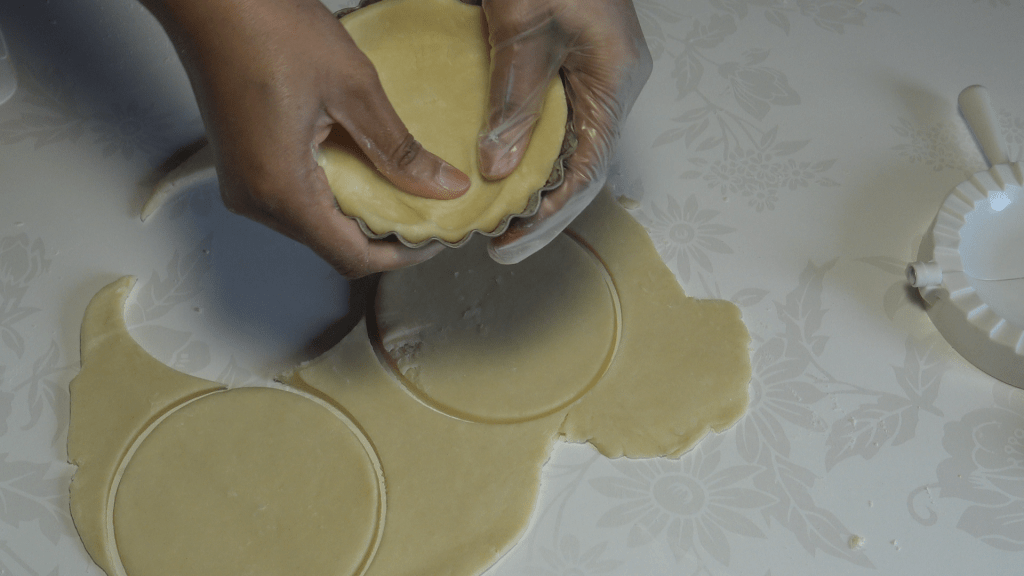 Etaler la pâte brisée sur un plan de travail légèrement fariné. Détailler des cercles un peu plus grands que les moules à tartelette.