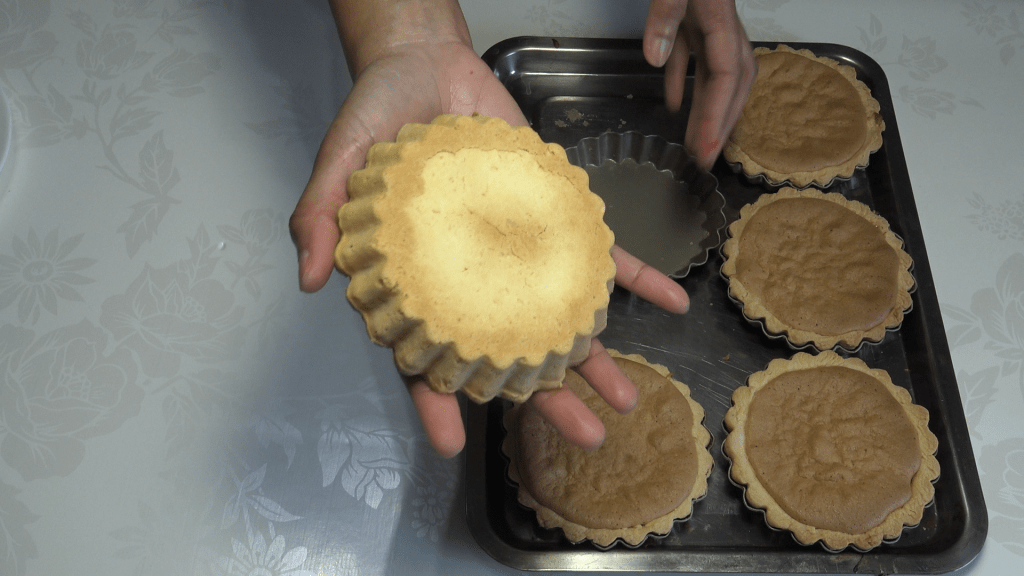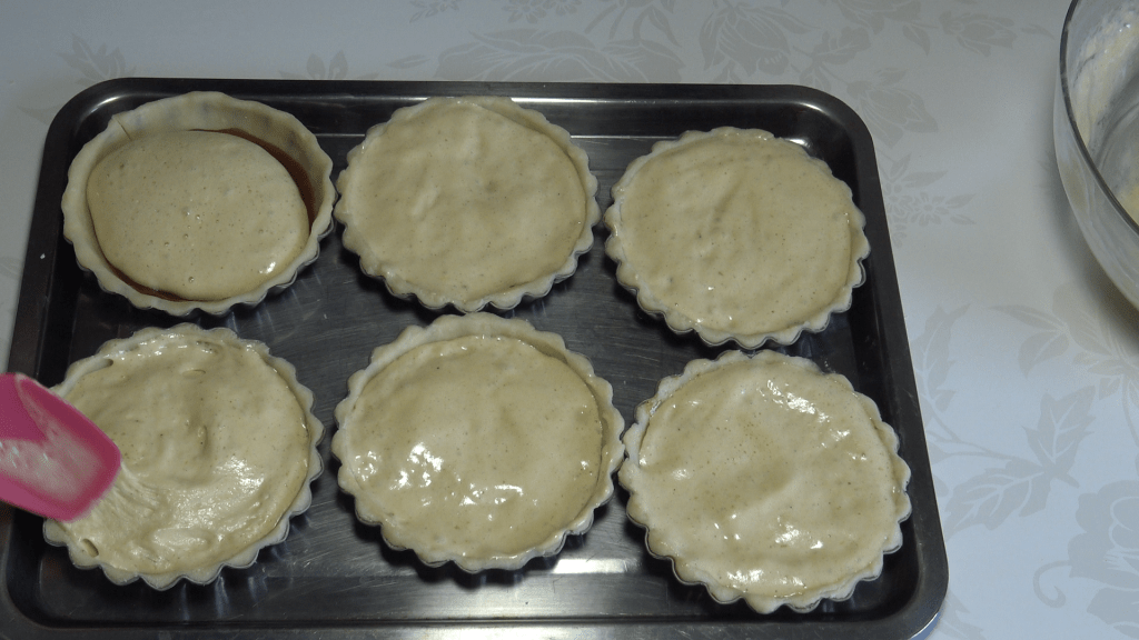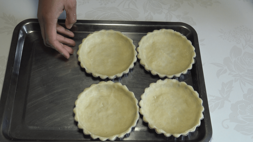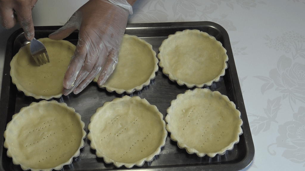 Disposer un cercle de pâte dans chaque moule beurré et fariné. Piquer le fond avec une fourchette. On peut aussi foncer directement les moules à tartelettes avec des morceaux de pâte.