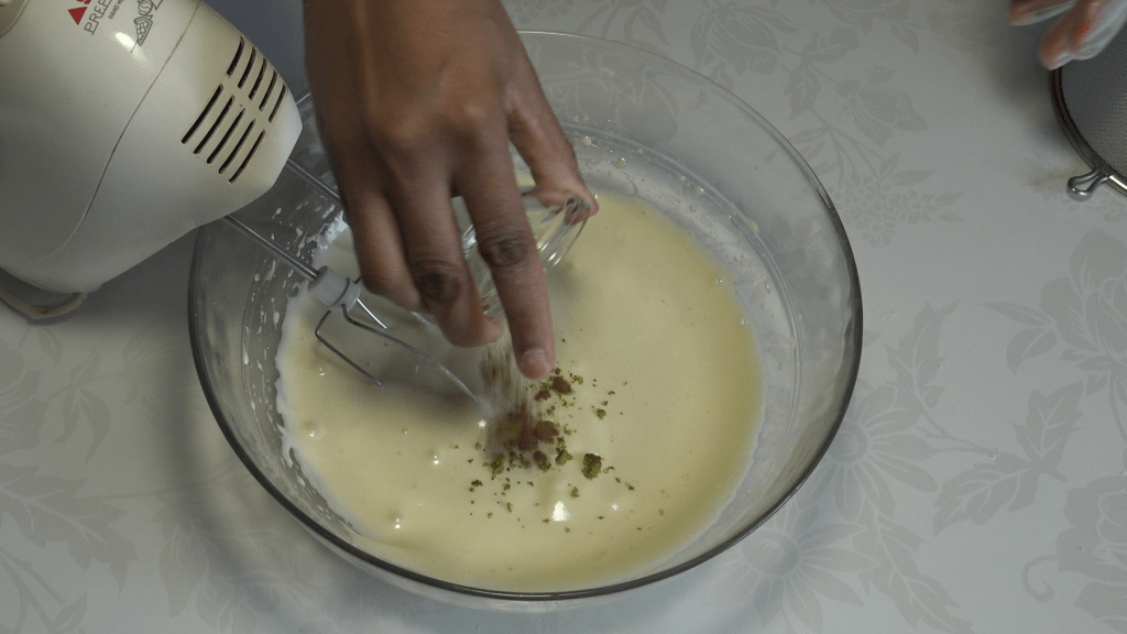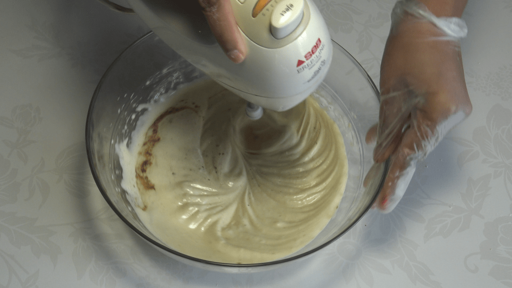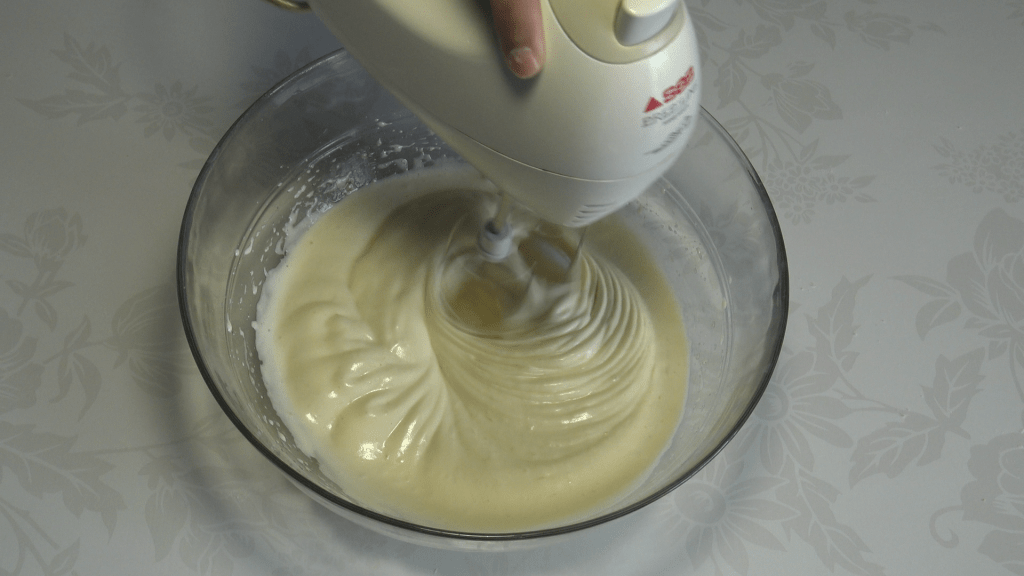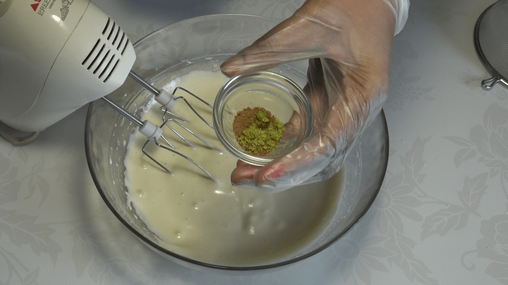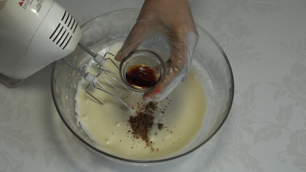 Préparer la génoise : battre les œufs avec le sel et le sucre, ajouter la vanille, l’arôme d’amande amère, le zeste de citron vert, la cannelle, la muscade et le rhum. Fouetter jusqu’à ce que l’ensemble soit bien mousseux (environ 3 minutes).