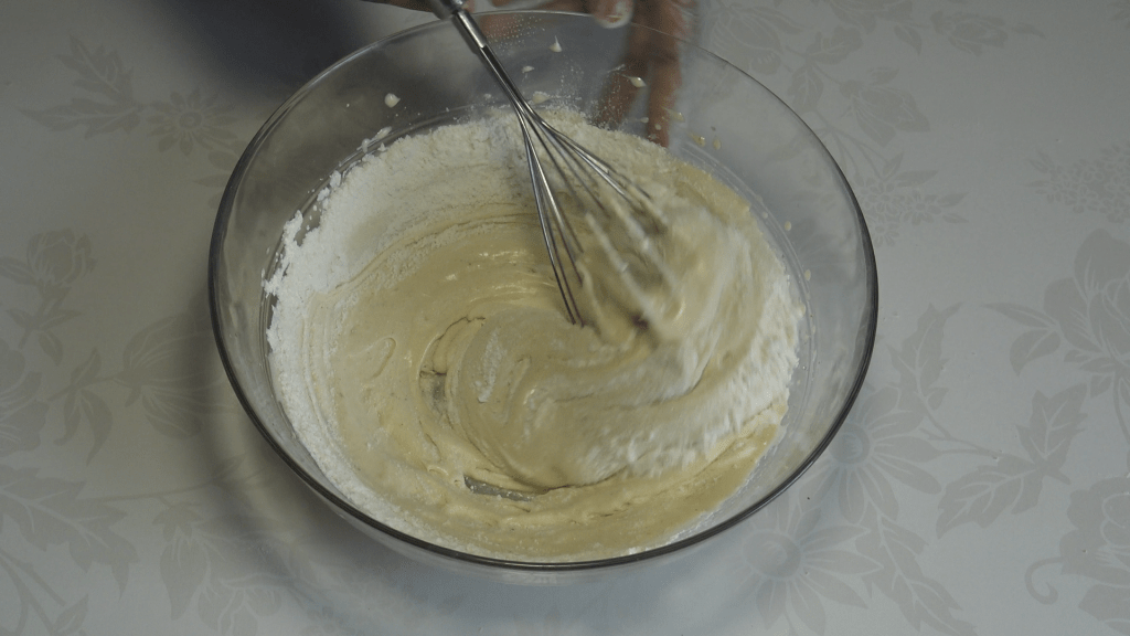Incorporer la farine et la levure chimique délicatement au fouet.