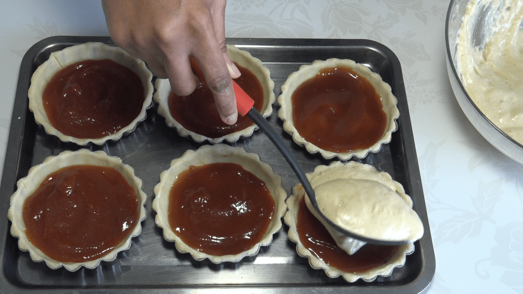 Montage : Etaler 1cs de confiture sur la pâte (ici confiture de goyave), recouvrir à hauteur avec la pâte à génoise.