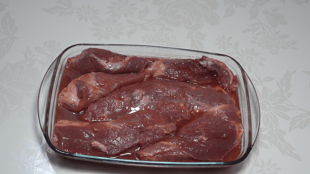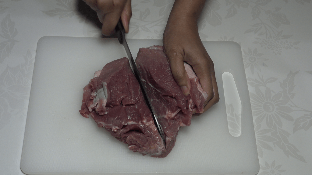 Couper l’épaule ou le filet mignon de porc en tranches épaisses.