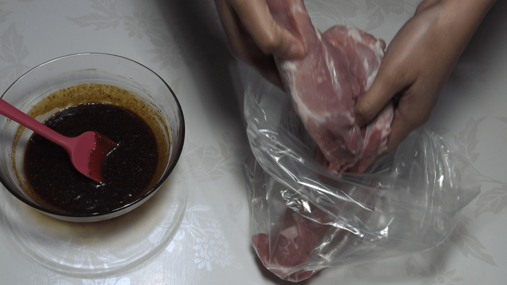 Placer le sac au réfrigérateur et laisser le porc mariner pendant au moins 4h ou toute la nuit c’est encore mieux.