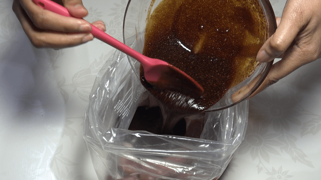 Verser la sauce dans le sac et masser le porc pendant environ 2 minutes pour que la sauce pénètre bien.