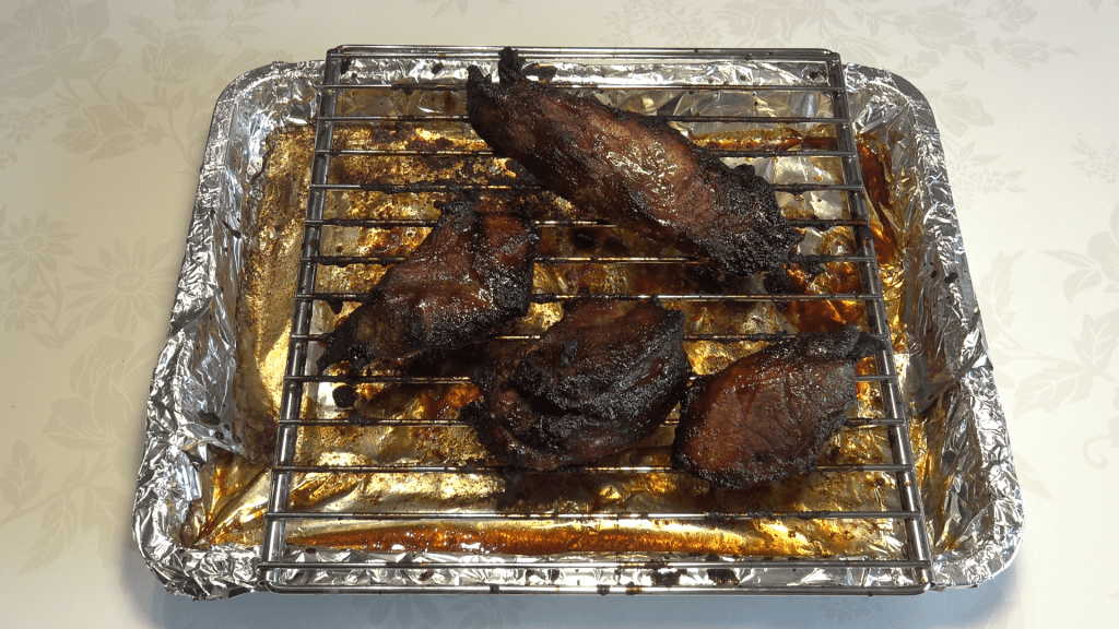 Ajouter un peu d’eau au fond plat de cuisson pour aider à créer de la vapeur pendant la cuisson du et pour empêcher les gouttes de marinades de brûler et de fumer en tombant dans le fond.