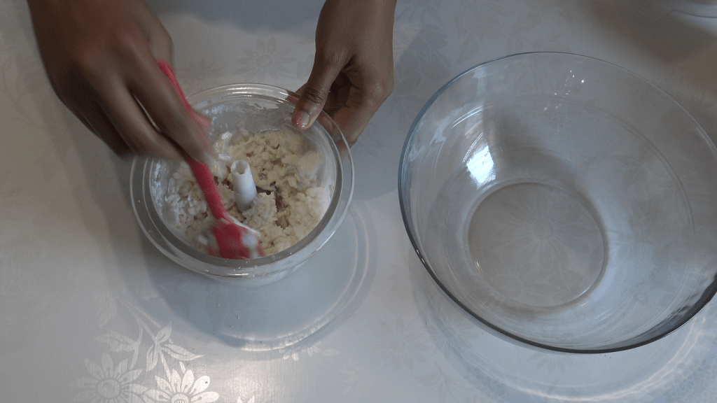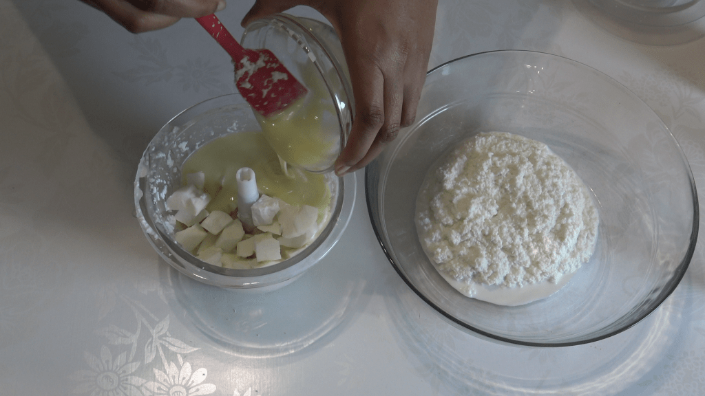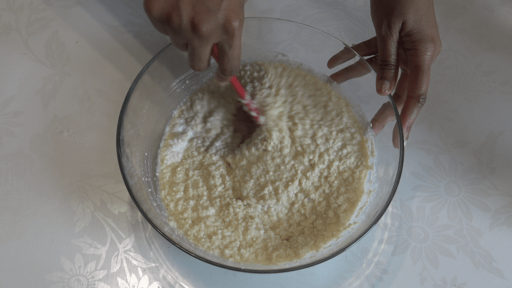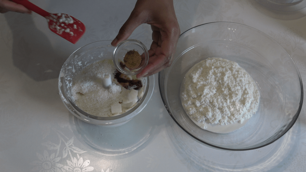 - Soit, si tu n’as pas d’appareil, tu peux commencer par râper le manioc et le coco. Ensuite, ajouter le lait de coco, le lait sucré, la vanille, la cannelle, la muscade et l’amande amère si tu as choisi d’en mettre. Bien mélanger le tout, puis verser le mélange dans le moule que tu auras préparé et cuire environ 1h si comme moi tu aimes ton pudding bien cuit, ou alors 35 min à 170°c.